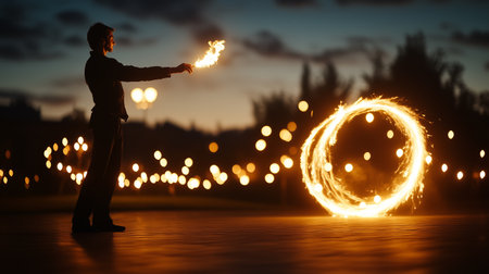 Fire performer creates mesmerizing patterns at dusk in a park surrounded by twinkling lights