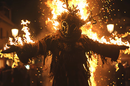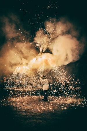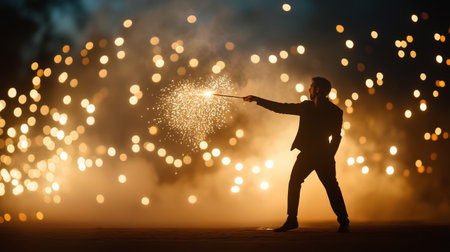 The man in the suit emits intense flames and sparkles, creating a dramatic and fiery spectacle against a dark night background. Horizontal photography