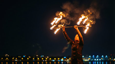 A talented fire dancer performs a mesmerizing show at night, holding a flaming staff high against a dark sky with distant city lights reflecting on the water.