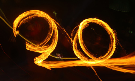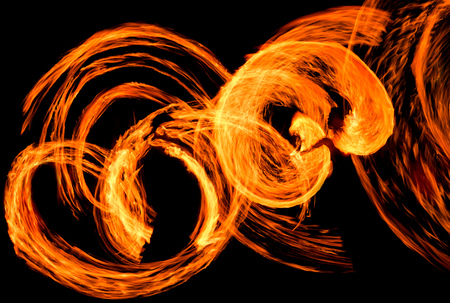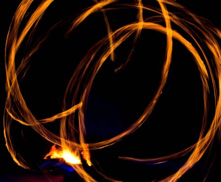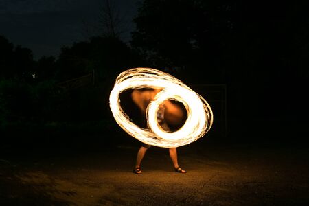Fire artist perform fiery circular arcs pattern at night in dark, fibonacci spiral