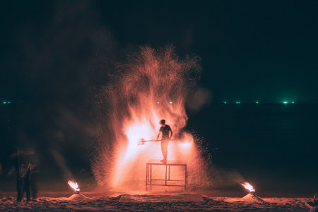 A striking image showcasing a male fire performer expelling a large flame into the night backdrop, creating an intense, energetic, and captivating visual display of fire artistry. Perfect for entertainment or dramatic contexts.