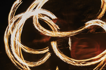 An unidentified man expertly spins torches with bright flames at a fire show. Against the background of darkness