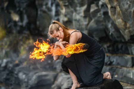 An enchanting fire dancer beautifully showcases her talent with mesmerizing flames during a performance.