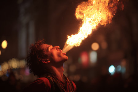 A skilled performer breathes fire during a nighttime festival in a vibrant city square. The illuminated crowd watches in awe as flames burst from his mouth, creating an exciting spectacle.