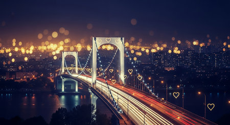 A bridge over a river with a city skyline in the background. The bridge is lit up at night, creating a beautiful and serene atmosphere