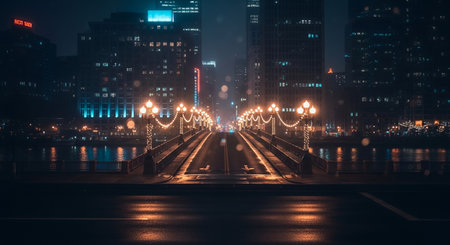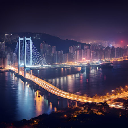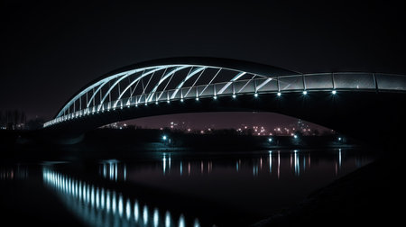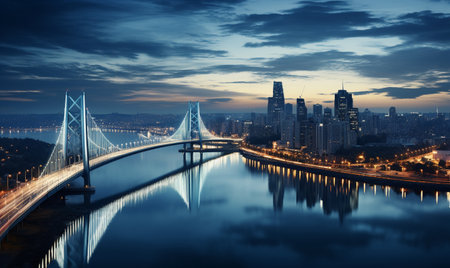 Captivating nighttime image featuring a modern bridge illuminated with bright lights, casting beautiful reflections on calm waters against a mesmerizing city skyline.