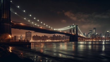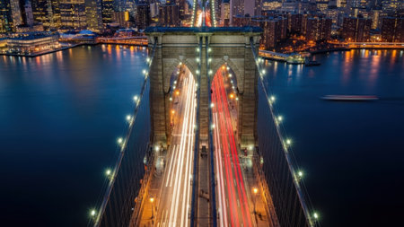 A stunning night view of the Brooklyn Bridge, illuminated with lights and featuring light trails from passing vehicles. The bridge spans across the East River, connecting Brooklyn and Manhattan. The cityscape in the background is lit up with vibrant lights, creating a picturesque urban scene.