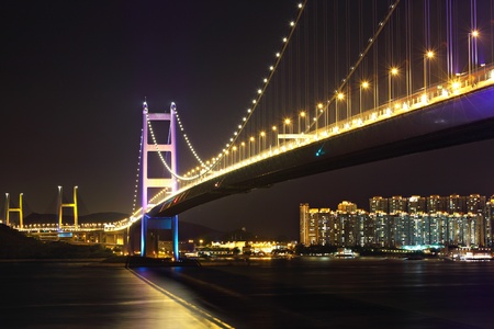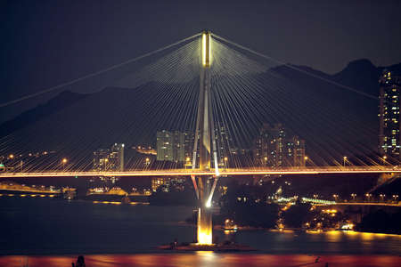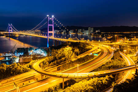 Sunset and light illumination of Tsing ma bridge landmark suspension bridge in Tsing yi area of Hong Kong China.