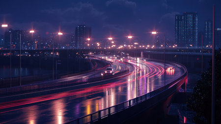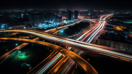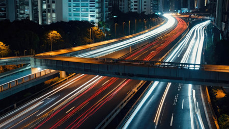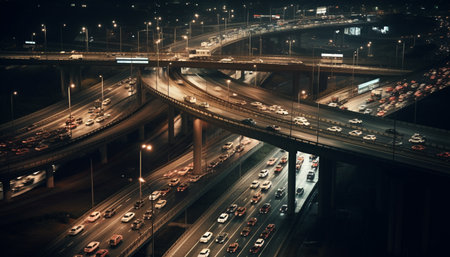 Nighttime rush hour on illuminated city highway with multiple lanes generated by artificial intelligence