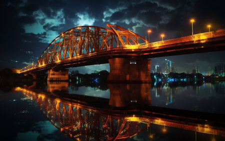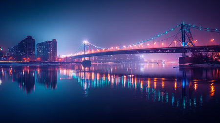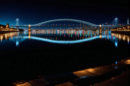 A long-exposure photograph showcases a large bridge at night, highlighted by vibrant lights. The image displays a symmetrical composition, with the bridge and cityscape reflecting in the calm water. The scene presents a dark background with an urban setting, suitable for various editorial and commercial applications.