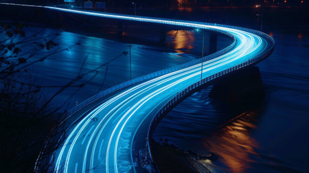Electric blue light trails follow the curves of a bridge mimicking the winding path of the river beneath it