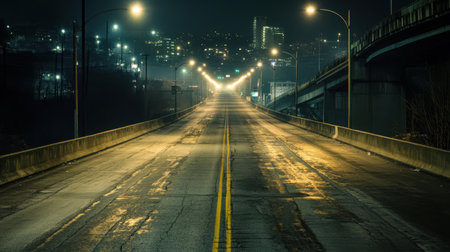 A desolate urban freeway at night, illuminated only by overhead streetlights and distant city glow.