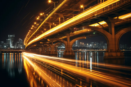 An abstract shot of a bridge over a river with playful car light trails creating a dazzling effect blending seamlessly with the blurred reflections on the waters surface