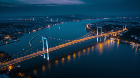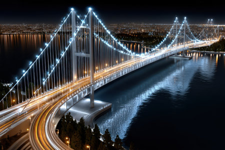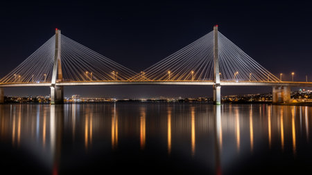 A panoramic view of a modern suspension bridge at night, with city lights reflecting on the calm river surface
