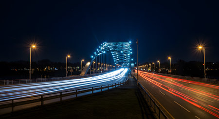 Nighttime long exposure of traffic light trails streaming over a modern illuminated truss bridge symbolizing urban speed and connection