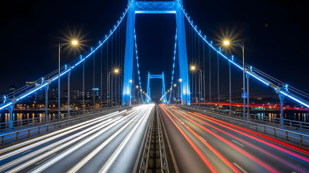 Blue lit suspension bridge at night with vibrant car light trails creating a dynamic urban scene