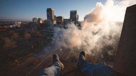 An overhead view reveals a cityscape bathed in sunlight, with a prominent plume of smoke adding visual interest. The scene presents modern architecture against a clear sky. Its composition and lighting are suitable for various commercial applications, including editorial or promotional material.