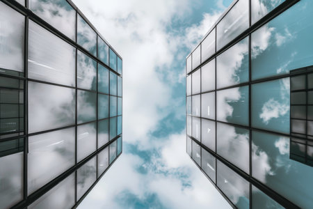 Clouds and sky reflected in windows of modern office building. Business concept.
