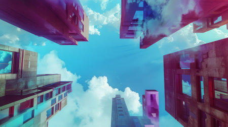 A striking perspective of a modern architectural building reaching towards a vibrant blue sky, capturing the essence of contemporary design and urban landscape.