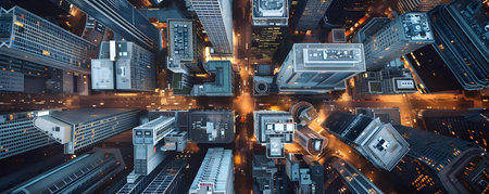 This stunning aerial image showcases a bustling urban landscape filled with towering skyscrapers, busy streets, and vibrant architecture during golden hour.