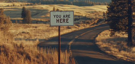 Road sign in the wilderness. Signpost with text You are here in the middle of field. Travel by car or hitch-hiking