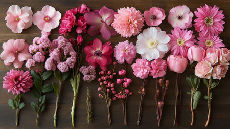 A collection of various pink flowers is displayed on a wooden surface. The arrangement features different species, each contributing to a harmonious blend of shades and textures.