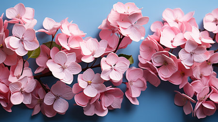 Hydrangea Background. Pink flowers. Natural floral concept. Botanical flowering background. Selective focus image. Panoramic border, banner, wedding romantic background. Flat lay.Copy space.