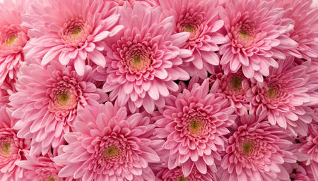 A carpet of pink chrysanthemums fills the frame, showing textured petals and lush greenery. Soft light enhances their vibrant colors. Bunch of flowers, dense bouquet