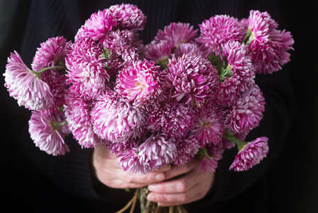 Autumn bouquet of lilac chrysanthemums on a dark background. Selective focus.