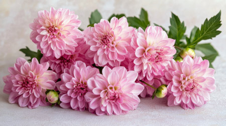 A cluster of pink dahlias rests elegantly on a soft surface, their lush petals radiating in shades of blush and rose, surrounded by green foliage creating a serene atmosphere.