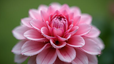 Vibrant pink dahlia with dew drops on petals against soft green background