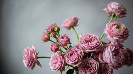 A lush and abundant bouquet of soft pink roses and ranunculus is captured in a detailed close-up. The showcases the intricate layers of petals, the varying stages of bloom, and the delicate textures of the flowers. The soft pink hues create a romantic and feminine atmosphere, while the soft lighting and subtle shadows enhance the depth and beauty of the floral arrangement. is conveying themes of love, beauty, and celebration.