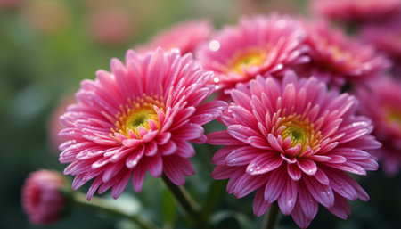 A stunning close-up of vibrant pink daisies adorned with sparkling droplets of dew captures the essence of a fresh morning. The lush green backdrop enhances the flowers beauty, creating a serene and uplifting atmosphere that invites viewers to appreciate natures artistry.