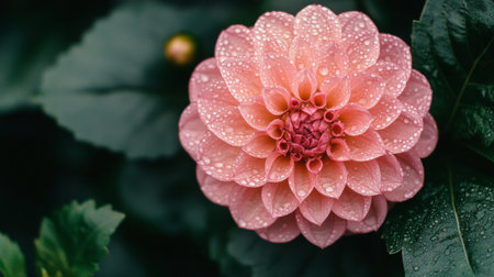 A stunning close-up of a pink dahlia flower adorned with shimmering dew drops, captured against rich green leaves, exemplifying the beauty of nature in a garden setting.