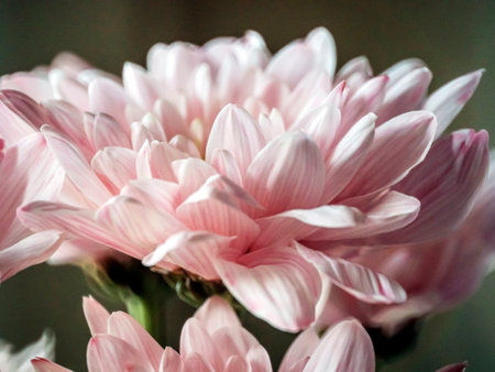 Macrophotography. Selected sharpness. Beautiful flower of delicate, pure pink chrysanthemum close-up. Vegetable texture