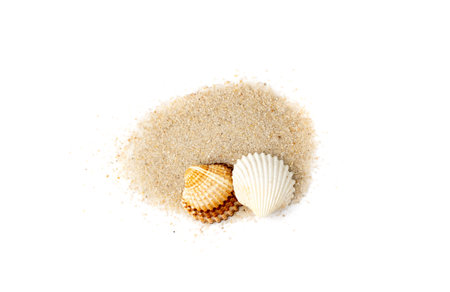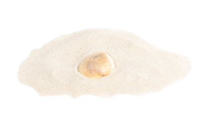 Pile of beach sand with sea shell on white background