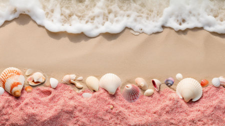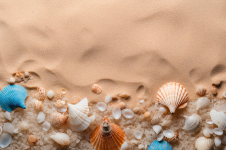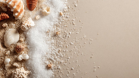 This captivating beach scene features an array of seashells and sea salt arranged on soft beige sand. Perfect for marine-themed projects, it evokes tranquility and natural beauty.