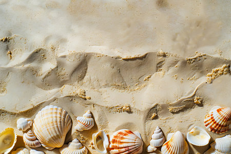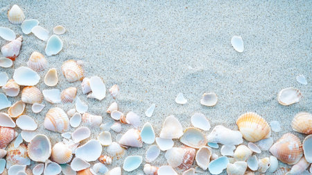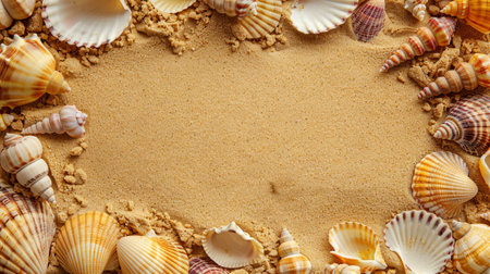 Seashells on sandy beach. Top view with copy space. Summer travel background design