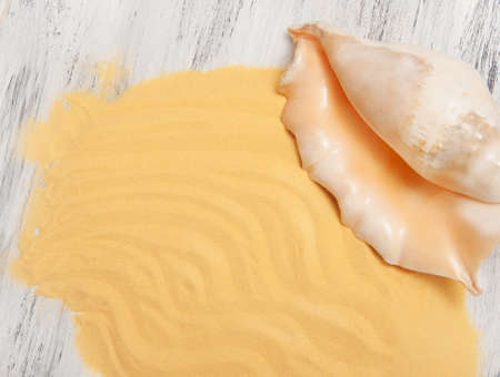 Different seashells and sand on wooden surface
