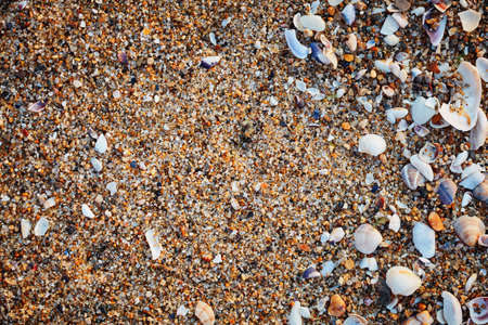 Top view of the sandy beach with seashells. Many different shells on the sand pattern.