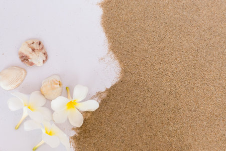 Sea shell and frangipani flowers whit have pile of beach sand isolated on white background.Summer holiday relax background
