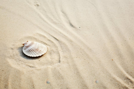 Curvy sand ripples hold seashell shadows, reflecting light in warm tones, perfect for summer vacation themes and family gatherings at the beach.