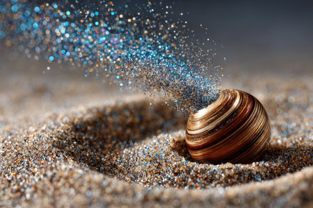 A golden shell sits in soft sand, emitting a trail of glittering particles into the air at dusk.