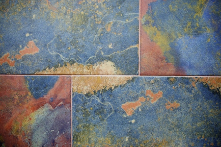 Rough stone texture with rust in blue and yellow colors with orange placed on a wall on a facade