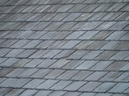 Detail of traditional gray slate roof tiles on a pitched roof