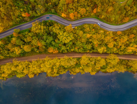 Winding road meandering through autumn forest in early morning light showcasing vibrant foliage and peaceful surroundings