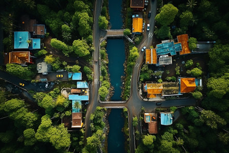 An overhead view reveals a residential area with organized streets, buildings, and green trees. The composition highlights the geometric arrangement, with a combination of buildings. The style showcases natural colors and lighting, suggesting a daytime scene. Suitable for a wide variety of commercial and editorial uses, it portrays organized urban planning.