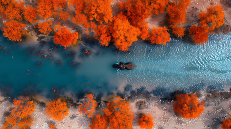 Aerial view of forest lake in autumn season. Colorful trees in water.