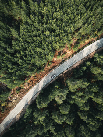 Aerial view taken by drone of a car driving on a forest road in autumn