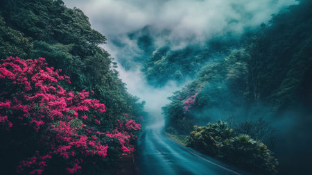 A serene road winds through lush greenery and vibrant pink flowers, enveloped in mist, creating an atmospheric and picturesque nature scene.